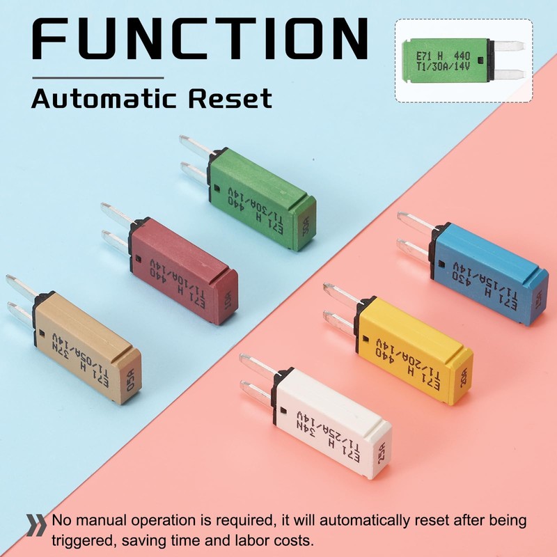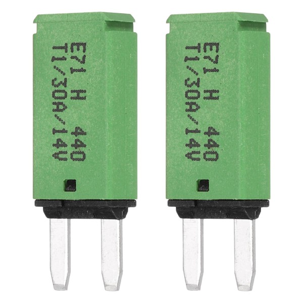 - Material:UL94 V-0 Thermoplastic, Tin-Plated Copper Alloy; Shape: Narrow Mini; Reset Mode: Automatic; Voltage: 14V DC; Current: 30A; Color: Green ; 2 Pack of Mini Fuse Circuit Breaker