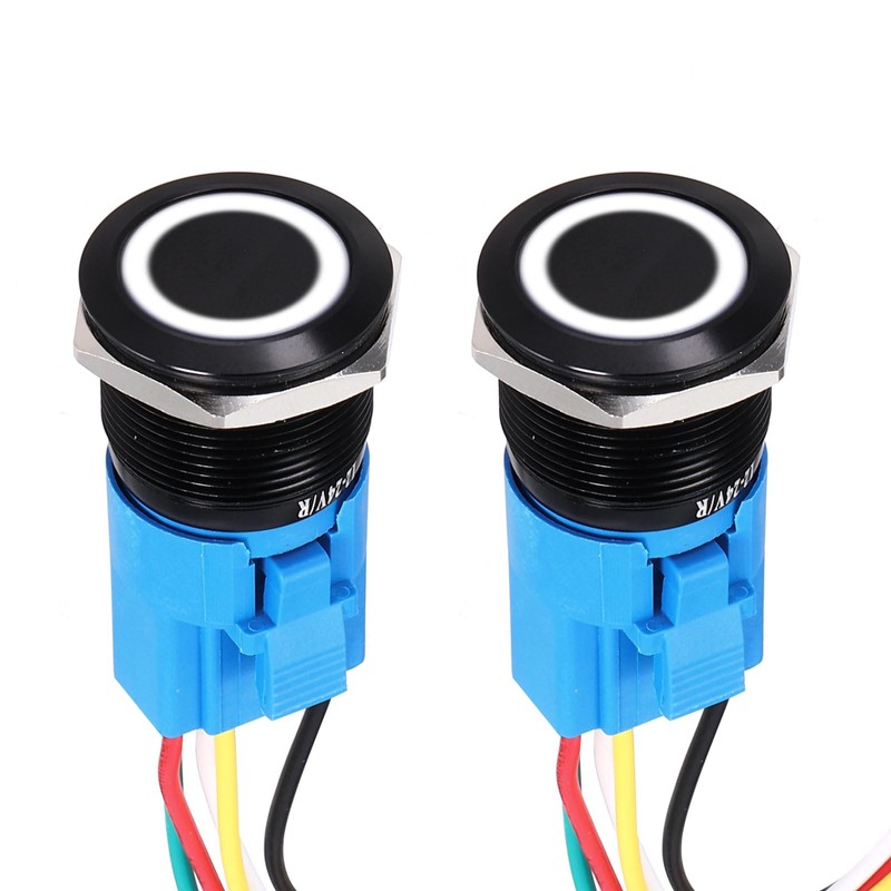 - Product Name: push button starter switch; Material: Aluminum Alloy; Mounting size: 22mm (0.9 Inch); Pin number: 5; Action Type: Latching; Rated Current: 3A; Rated Voltage: 12-24V; Contact Type: 1NO1NC; Button Shape: Flat Head; Button Color: Black; Light Color: White; Light Pattern: round; IP Grade: IP66; Wiring Method: 15cm wire socket; Style: self-reset; Package Content: 2 x push button switch