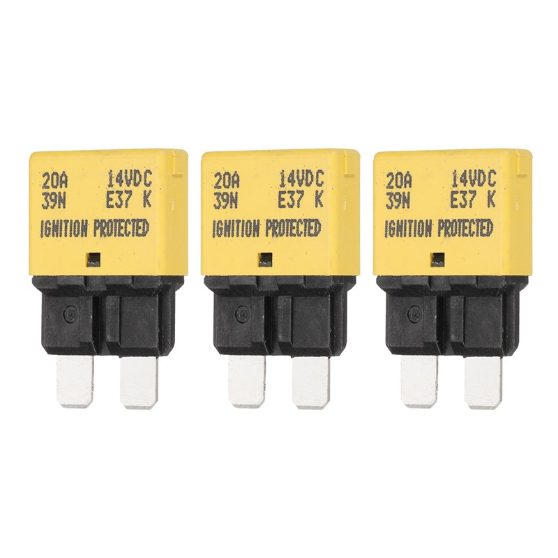 - Material:UL94 V-0 Thermoplastic, Tin-Plated Copper Alloy; Shape: Mini; Reset Mode: Automatic; Voltage: 14V DC; Current: 20A; Color: Yellow ; 3 Pack of Mini Fuse Circuit Breaker