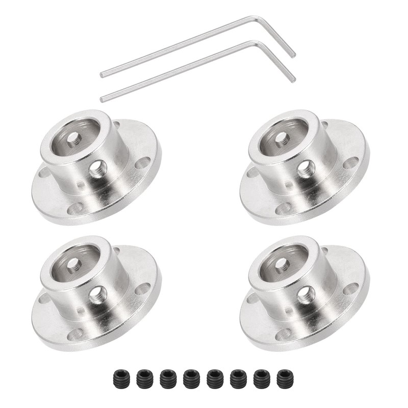 - Size: Inner Diameter: 12 mm; Total Height: 13 mm; Cylinder Outer Diameter: 18 mm; Base Plate Diameter: 32 mm; Diagonal Screw Hole Distance: 24 mm; Base Plate Hole Diameter: 4 mm; Material: Iron Plated; Package Includes: 4 pcs x Rigid Flange Coupling, 2 pcs x 2 mm Mini Hex Wrench, 8 pcs x M4 Fixed Screws