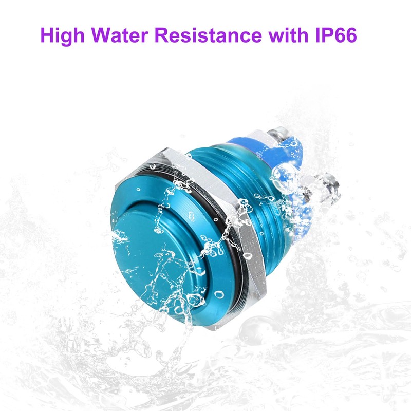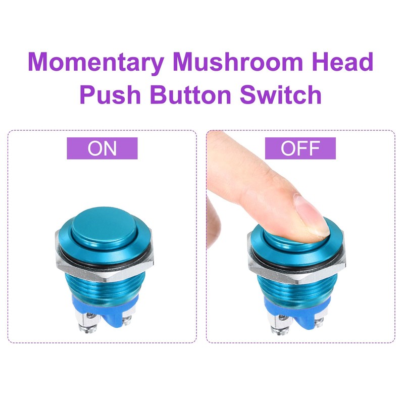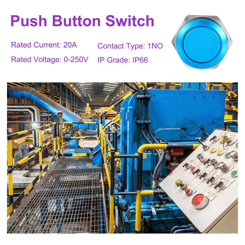 - Product Name: push button starter switch; Material: Aluminum Alloy; Mounting size: 19mm (3/4 Inch); Pin number: 2; Action Type: Latching; Rated Current: 5A; Rated Voltage: 0-250V; Contact Type: 1NO; Button Shape: High Head; Button Color: Blue; Light Color: No Light; Light Pattern: No Pattern; IP Grade: IP66; Wiring Method: screw feet; Style: self-reset; Package Content: 5 x push button switch