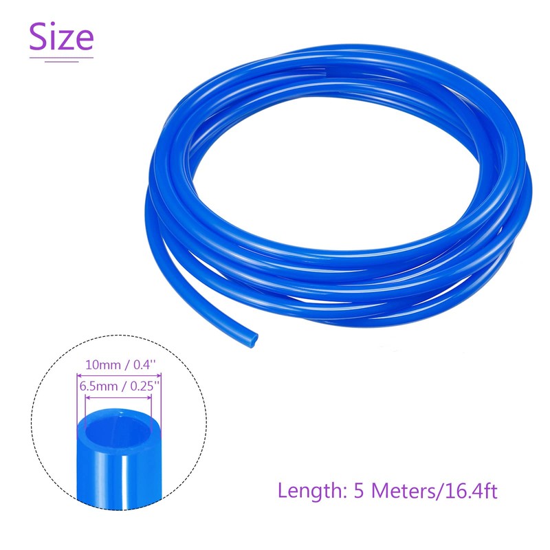 - SIZE: ID x OD: 6.5mm(0.26inch) x 10mm(0.39inch); Total Length: 5 Meters(16.4ft); Compression-resistance (in Usual Temp.): 0.8MPa(8.5kgf/cm2); Tensile Stress: 550kg/cm2; 1 Pack of Pneumatic Air PU Hose.
