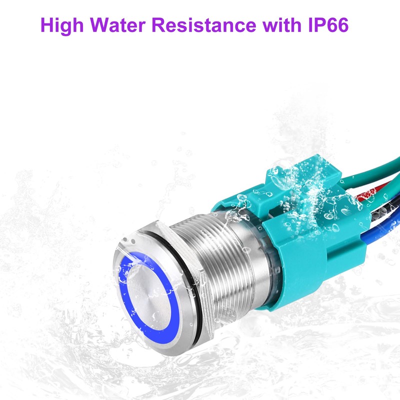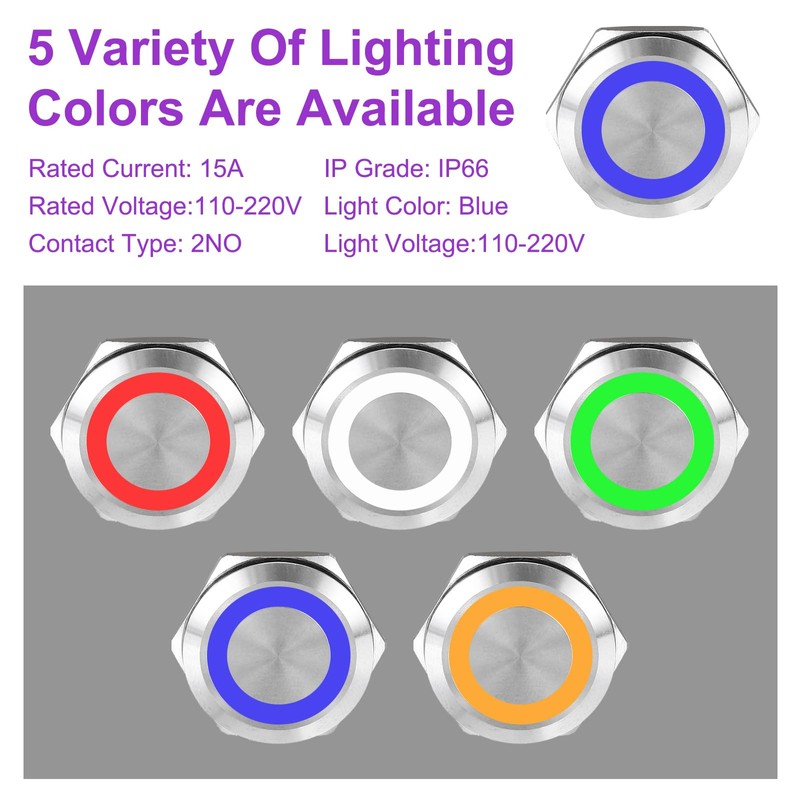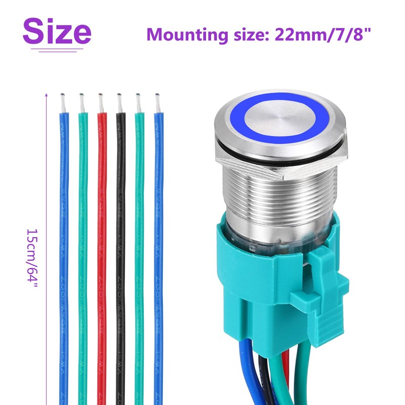 - Product Name: Push Button Switch; Material:Stainless Steel; Mounting size: 22mm/ 7/8 Inch; Total size: 190x24mm/7.5x0.94 Inch; Pin number: 6; The pattern of Light: Ring; Action Type: Latching; Wiring methods:With 15cm/6 Inch pre-soldered wire; Rated Current: 15A; Rated Voltage: 110-220V Contact Type: 2NO; Button Shape: Domed Head Button Color: Silver; Light Color:Blue Light Voltage: 110-220V; IP Grade: IP66; Package Content: 1 x Cable Socket, 1 x Nut O-shaped Ring