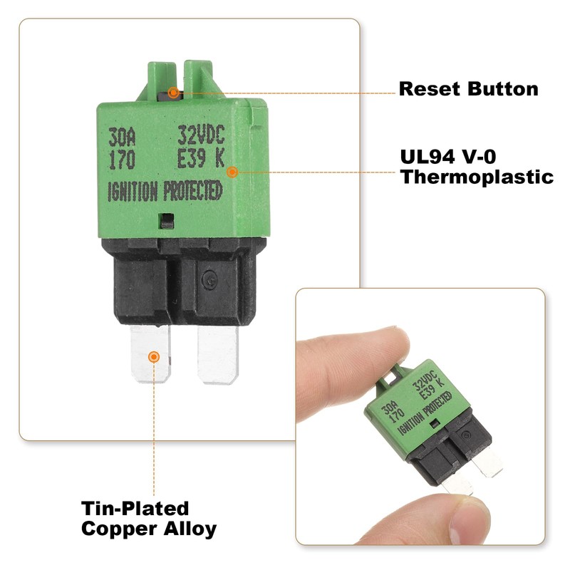 - Material: UL94 V-0 Thermoplastic, Tin-Plated Copper Alloy; Shape: Mini; Reset Mode: Manual; Voltage: 32V DC; Current: 30A; Color: Green; 1 Pack of Mini Fuse Circuit Breaker