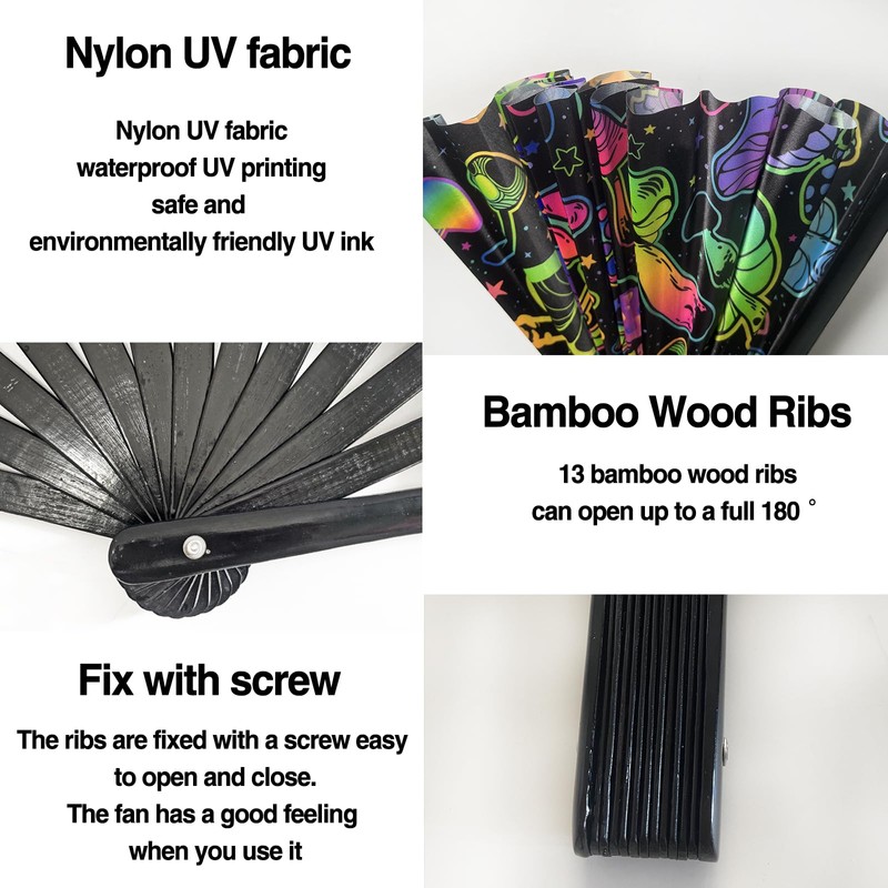 • Attractive and Charming: the bamboo fan adopts a classical glitter design,Fluorescent ink printing.it will be shiny under the lights or sun lights, adding attractiveness and charm to your performances, creating a hot atmosphere.Lightweight yet sturdy, you can carry techno festival fan anywhere.Fan the wind to cool off.