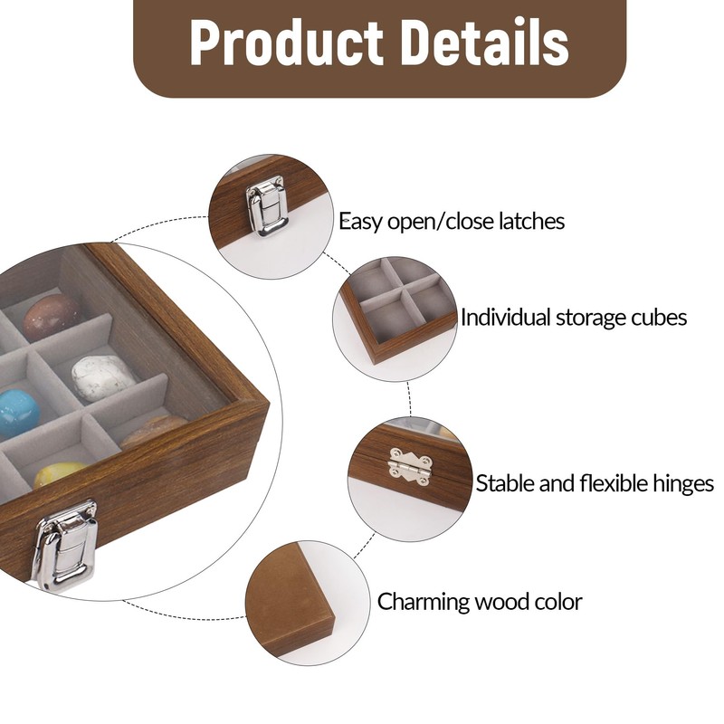 • Premium Materials: Crafted from high-quality wood, this wooden rock collection Box boasts exceptional sturdiness and durability with a naturally beautiful grain. The interior features velvet-lined compartments to protect collectibles from scratches, while the clear lid offers a clear view of your items, combining robust construction with elegant aesthetics