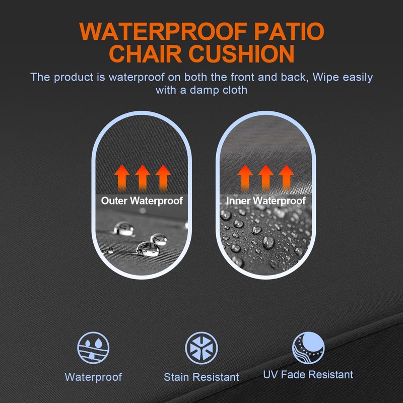 - 【Waterproof Cover】Patio furniture cushions with hidden zipperand double layer protection waterproof cover,all-round waterproof to keep rain out and protect the inside foam. Also, these chair cushions for outdoor furniture are super easy to maintain and clean, spot clean with damp cloth,then hang them to dry.