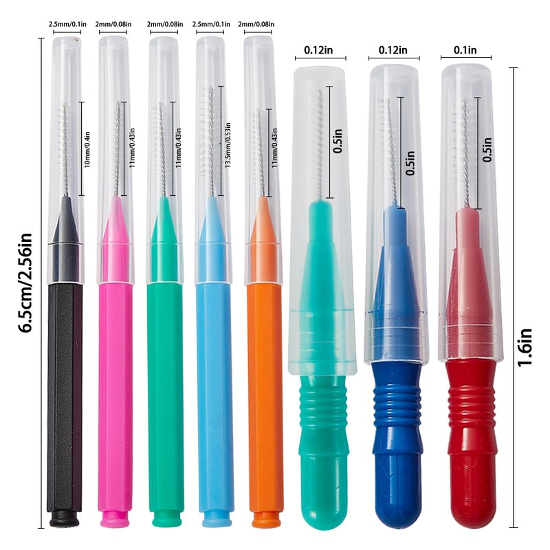 - 【3 Sized Brush Heads】These 88 pieces interdental brushes have 3 different sizes brushes heads. The 2mm brush head is suitable for tooth spacing 0.7mm; the 2.5mm brush head for 0.8-1.0mm toot spacing; the 3mm brush head for 1.0-1.2mm tooth spacing.