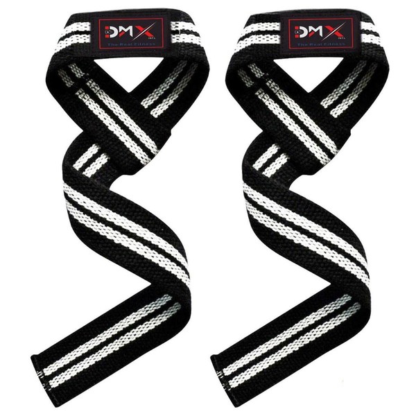 DMX INTL Weight Lifting Straps Single Loop Neoprene Padded Cotton Wrist Strength Support Non Slip Premium Quality Bar Strap (Pair) (Black/White)