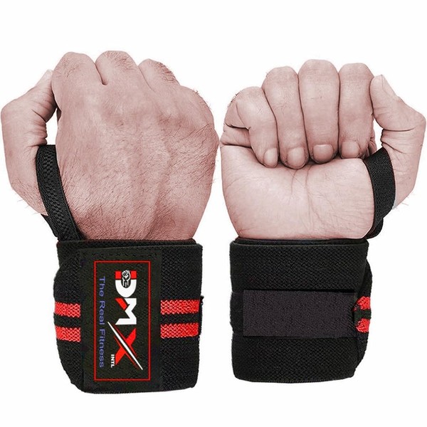 DMX INTL Weightlifting Wrist Wraps with Heavy Duty Thumb Loop Ideal for Wrist Support During Powerlifting, Strength Training, Bodybuilding Workout (Black & Red)