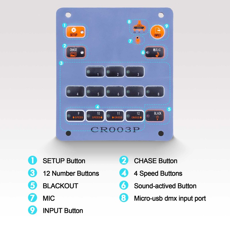 - El Panel de Pared DMX Pknight es un Controlador DMX autónomo que parece un interruptor de luz y es una caja montable en la pared, el CR003P es la manera más fácil de controlar tus luces DMX para uso diario. Te permite tener tus escenas más utilizadas disponibles al presionar un botón. Son la solución perfecta para instalaciones con muchos voluntarios, como iglesias y escuelas.
