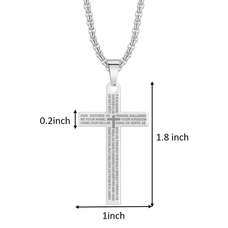 - [MEASUREMENTS] Lord's Prayer Cross Pendant1.8 inch(46mm)*1 inch(26mm),a free cable chain 24 Inches(600mm), Product Weight 19.5g / 0.69oz, symbolizing deep faith.