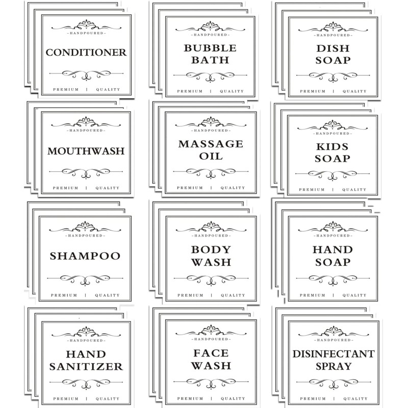 - 【Package Included】36 pcs preprinted waterproof soap labels sticker titled "Kids Soap" "Bubble Bath" "Dish Soap" "Mouthwash" "Massage Oil" "Shampoo" "Conditioner" "Body Wash" "Hand soap" "Hand Sanitizer" "Face Wash" "Disinfectant Spray". A total of 12 models (3 pieces each)