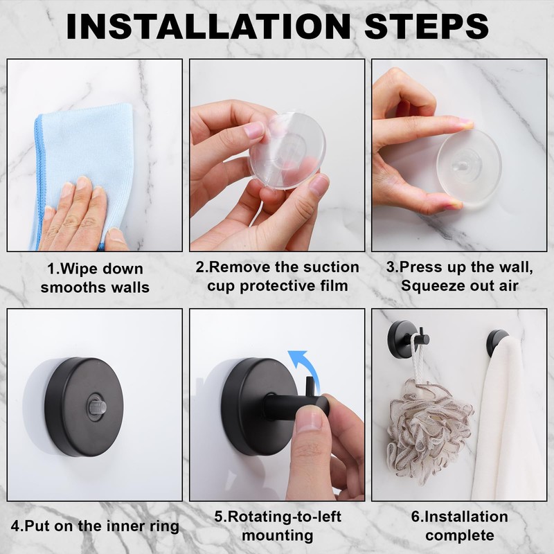 - 【Easy Installation】After cleaning and drying the area to be pasted, just tear off the suction cup protective film, press the suction cup hook against the wall, press hard to expel the air, and then tighten the knob clockwise. No drilling, no tools such as screws, no more unsightly holes on the wall.