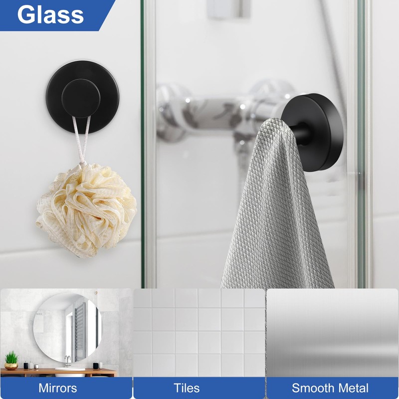- 【Widely Used】The vacuum suction cup hook can be firmly adsorbed on smooth and non-porous surfaces such as shower glass doors, mirrors, glossy tiles, smooth plastic surfaces, windows, stainless steel, quartz, laminate, etc. Suitable for bathrooms, kitchens, living rooms, bedrooms, offices, etc. Note: Not suitable for dusty and uneven surfaces such as lime walls, painted walls, wallpaper, logs, etc.
