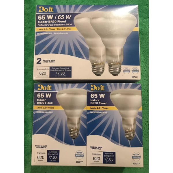 You will receive what is in pictures 2- 2 packs (4) BR 30 floodlight’s made by DO IT . These have 620 lumens which is the brightness of the bulb (that’s really good) 65 watts flood/reflector with a medium base.