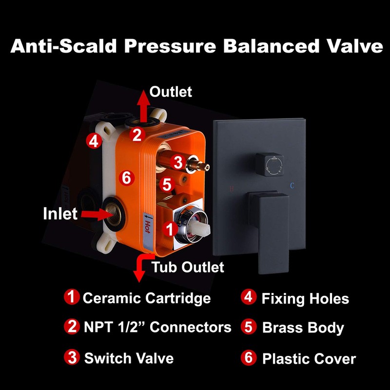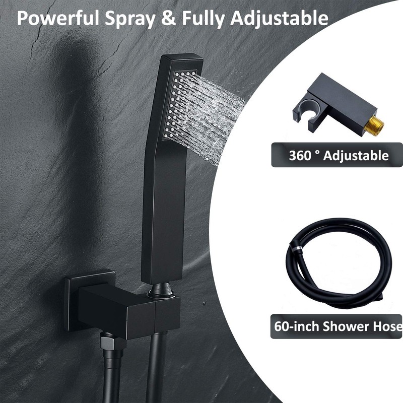 - Professional Technology and High Quality - All parts of this 3-mode rainfall shower system are made of high-quality materials with professional technology. Those parts include 12-inch square rain shower head, handheld shower head, tub spout, 15 inches shower head arm, shower holder, pre-embedded anti-scald valve, and 60 inches shower hose. The matte black finish and brass combination offers anti- corrosion and classical looking.