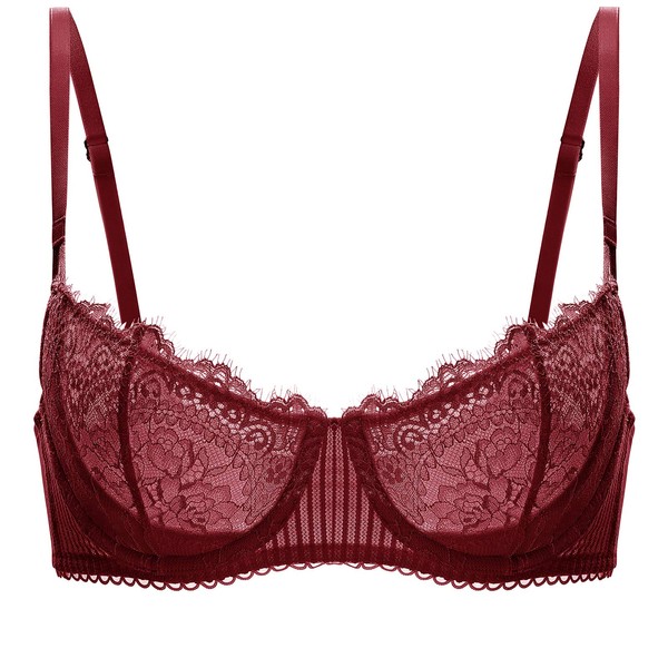 DOBREVA Women's Lace Balconette Bra Half Cup Non Padded Push Up Underwire Sheer Bras Dark Red 32C