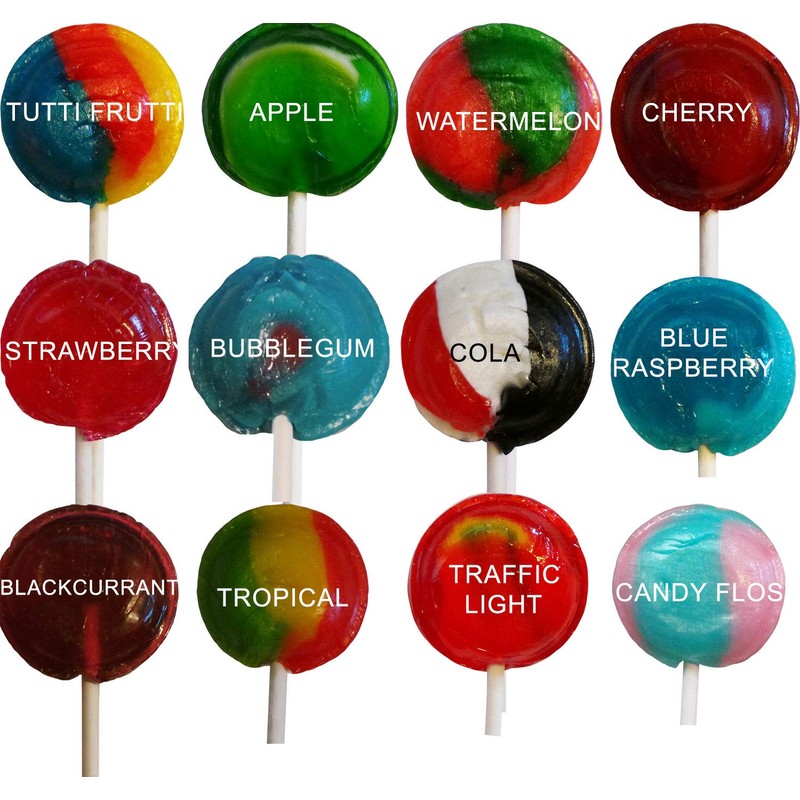 - Selection of different flavoured, individually wrapped lollies for you to try. Each flavour is also available as a pack of 12.
