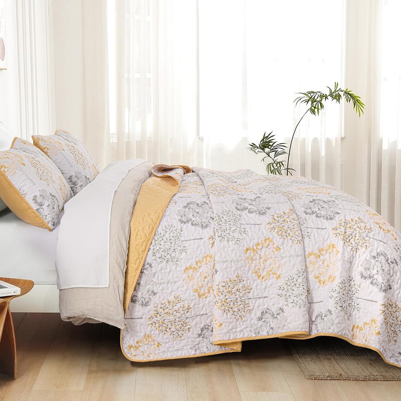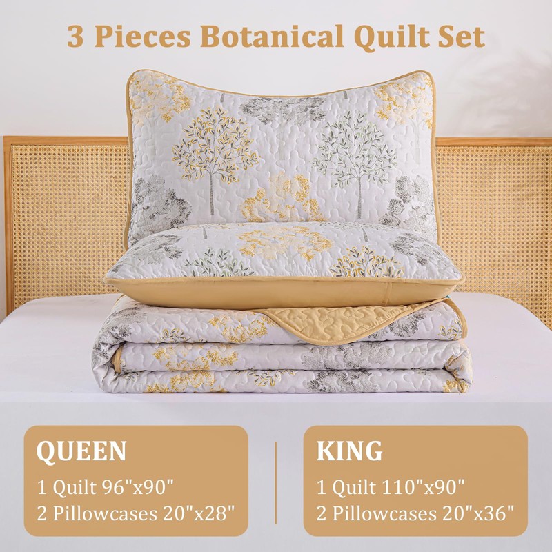Dobuyly Quilt Queen Size Set, Yellow Botanical Bedspread Coverlet Set 3 Pieces, Soft Microfiber Plants Tree Pattern Bedding Set for All Season, 96"x90"