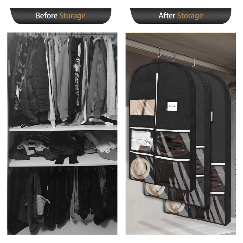 - SPACIOUS CAPACITY This zippered clothes cover has 4 clear pockets that provide extra storage space. A single garment protection bag can hold about 4 suits or 8 shirts. Set of 3 garment bags can hold a total of 12 jackets or 9 winter coats and covers your storage needs