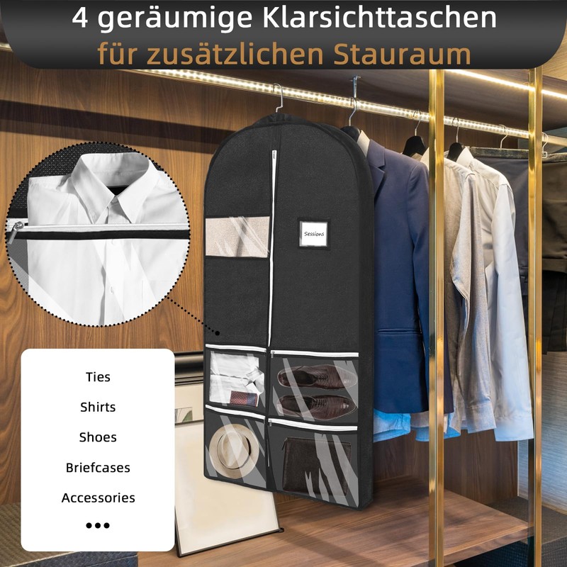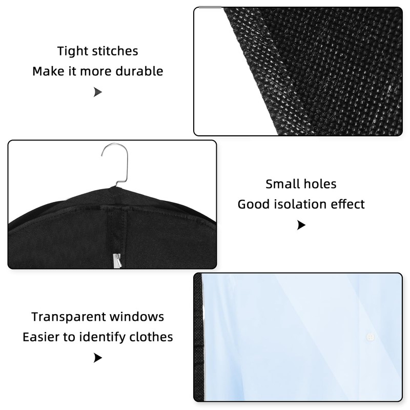 - Transparent window, precise clothes detection: the suit cover has a unique transparent window that allows you to quickly identify the clothes inside, which saves time. The travel bag for clothes small hook hole design at the top entrance and the tightly sealed bottom provide extra protection from dust, dirt and moths to keep your clothes clean and protected