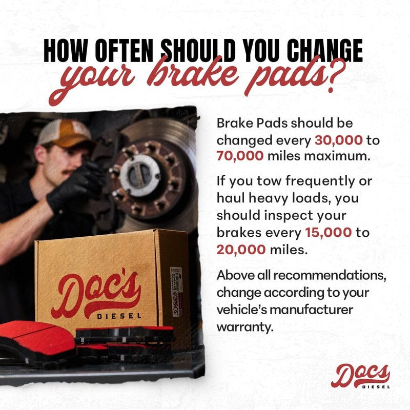 • REPLACEMENT GUIDELINES: Above all recommendations, change according to your vehicle’s manufacturer warranty. Brake Pads should be changed every 30,000 to 70,000 miles maximum. If you tow frequently or haul heavy loads, you should inspect your brakes every 15,000-20,000 miles.