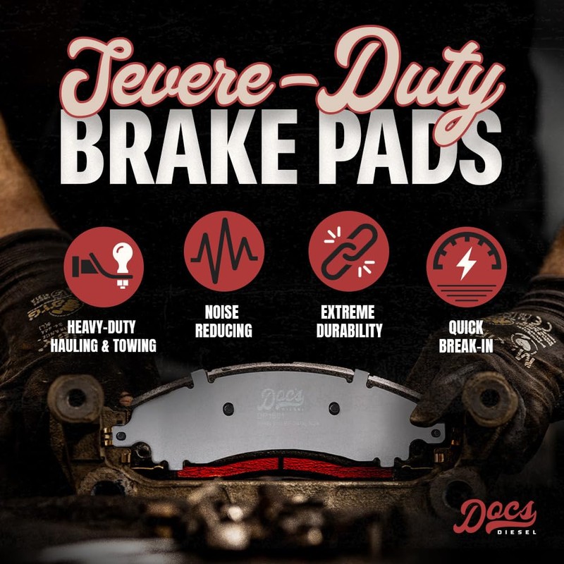 • DOC'S DIESEL SEVERE DUTY BRAKE PADS - Doc's Severe Duty Brake Pads deliver exceptional stopping power for high-performance diesel vehicles. Designed with OE-matched slots and chamfers, these semi-metallic pads offer a perfect fit and durable, long-lasting friction that helps reduce both noise and brake dust. They come equipped with a red break-in coating for quick performance, along with rubberized hardware and multi-layer shims to ensure smooth, noise-free braking. With high-temperature brake lubricant included, installation is hassle-free, and you can count on reliable performance mile after mile.
