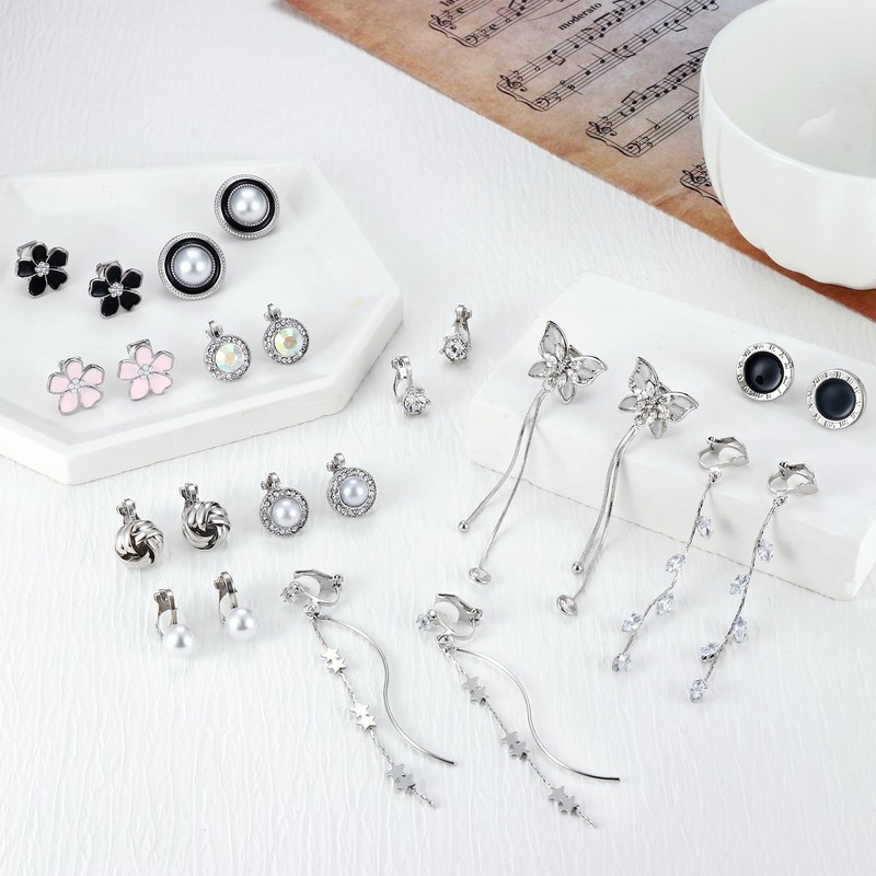 - Clip On Earrings Set: 12 pairs cute clip on earrings set, including pearl clip on earrings, silver cubic zirconia clip on earrings, twisted clip on earrings, flower clip on earrings, butterfly clip on earrings, long chain dangling earrings, etc, which will make you more fashionable and charming when you wear them.