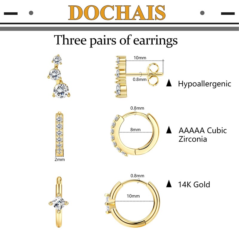 Dochais 3 Paar 14 Karat Vergoldet Damen Ohrringe Cubic Zirkonia Cartilage Stud Ohrringe und Ohrstecker für Frauen Mädchen Hypoallergen Sleeper Trendige Kleine Creolen Huggie-Ohrringe Set (Gold2)