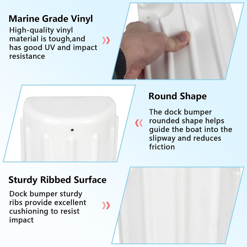 - 【High-Quality Boat Dock Bumper】The dock bumper fender is made of marine-grade vinyl material,which is UV-resistant, impact-resistant, tear-resistant,and corrosion-resistant,making it very practical.Boat dock bumper guards are soft, tough and suitable for all seasons,providing complete protection for docks and boats.The marine dock bumpers white can adapt to various docking spaces and provide comprehensive coverage for your edge of dock