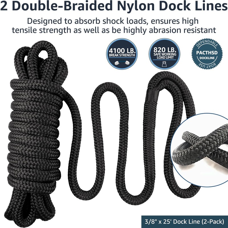 - Each 3/8 inch x 25 ft dock line is pre-spliced with a 12-inch loop, allowing for creating quick, easy loops and knots. Our marine-grade double-braided nylon boat ropes make docking quicker and easier. Pacthsd determined to provide you with the best hassle-free dock lines