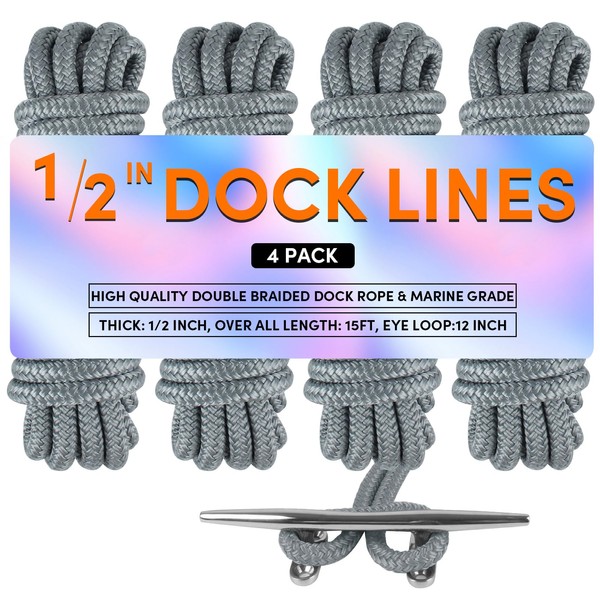 Dock Lines Boat Ropes for Docking 1/2" x15' Double Braided Mooring Marine Rope Boat Lines for Docking, Dock Lines for Boats with Loop, Gray 4 Pack
