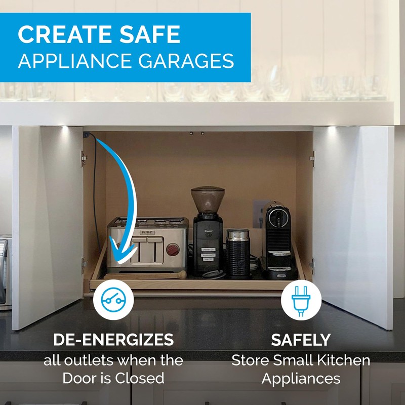 - [SMART DESIGN] Designed for use in kitchen appliance garages, this product will detect the position of a cabinet door and cut power to the outlet whenever the door is closed.