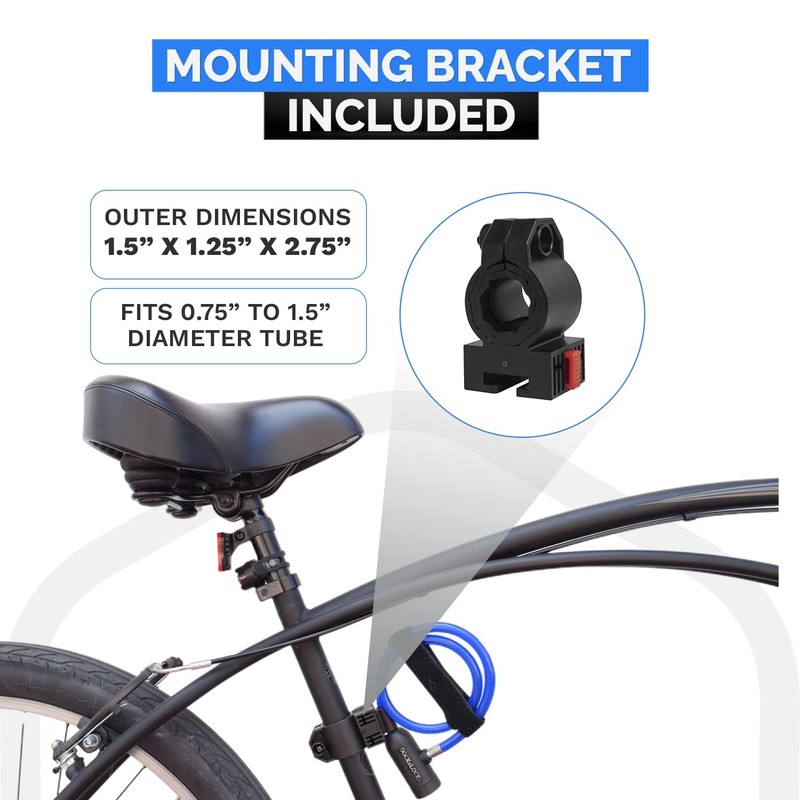 - Mounting bracket included. The security cable lock set includes an upgraded mounting bracket. Attach the bracket to any seat or frame post. The bracket fits any post size 0.75” to 1.5” in diameter. The cable’s bracket connector easily slides into the mounting bracket and clicks into place. To release the cable from the mounting bracket, simply push the red button and slide the cable out from the bracket.