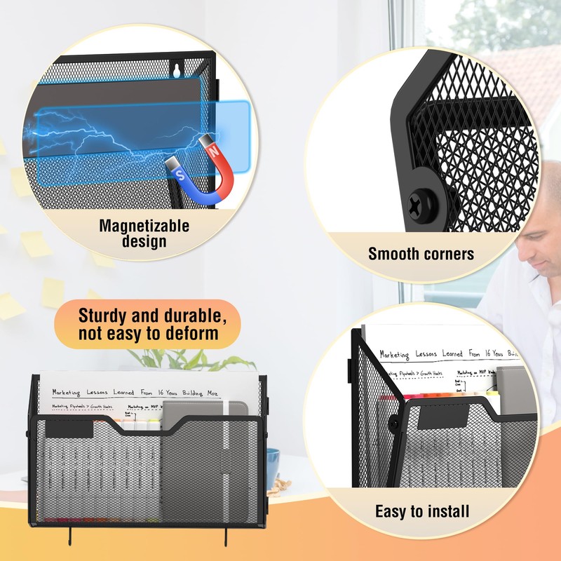 - Enhanced Multi-Functional Design-This 3 pack wall hanging file organizer and magnetic file holder offers versatile storage solutions. Use it as a wall file holder, mail organizer wall mounted, or magnetic paper holder - perfect for offices, kitchens, and dorms. The built-in magnets allow attachment to metal surfaces like cabinets or fridges, while wall-mount capability creates space-saving vertical storage