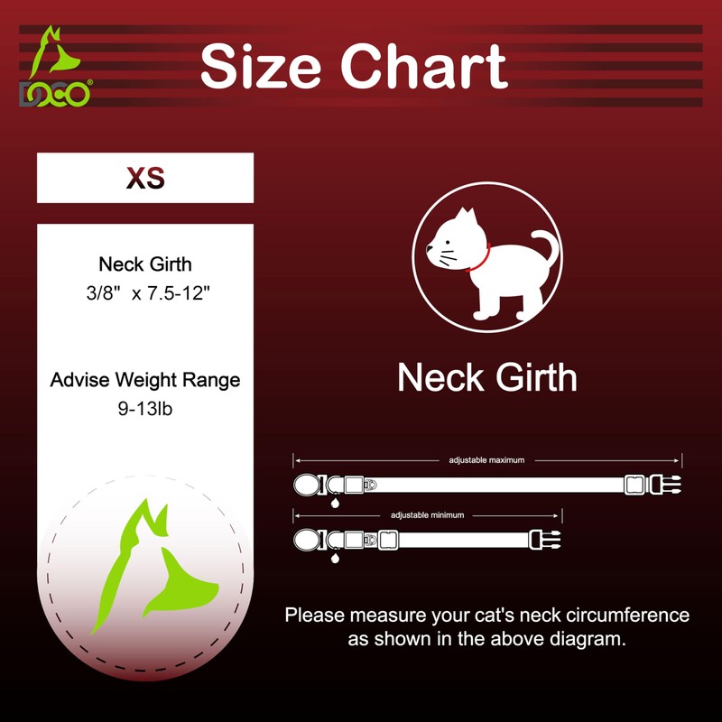 - DURABLE, MADE TO LAST - The DOCO Cat Breakaway Collar is designed with high-quality heat transfer designs that dense premium webbing making it resistant to mildew, aging, and suitable for all weather conditions. It has a heavy-duty D-ring with color matching cat bells.