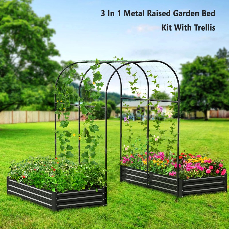 - 【3 IN 1 Raised Garden Bed with Trellis】DoCred Raised garden bed kit comes with 2 raised garden beds, one 87inch tall garden arch trellis for climbing plants, paired with climbing net for support, making it a comprehensive gardening solution. Upgraded design provides you with convenience and affordability.