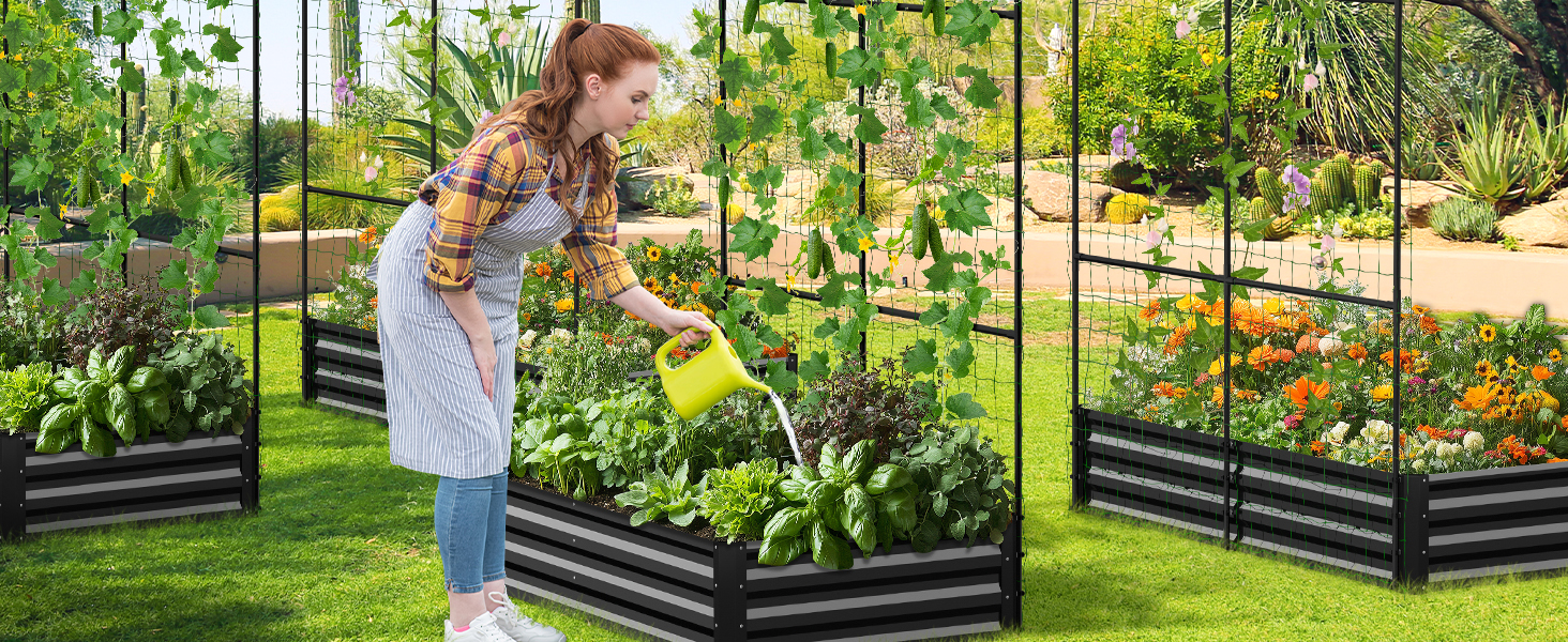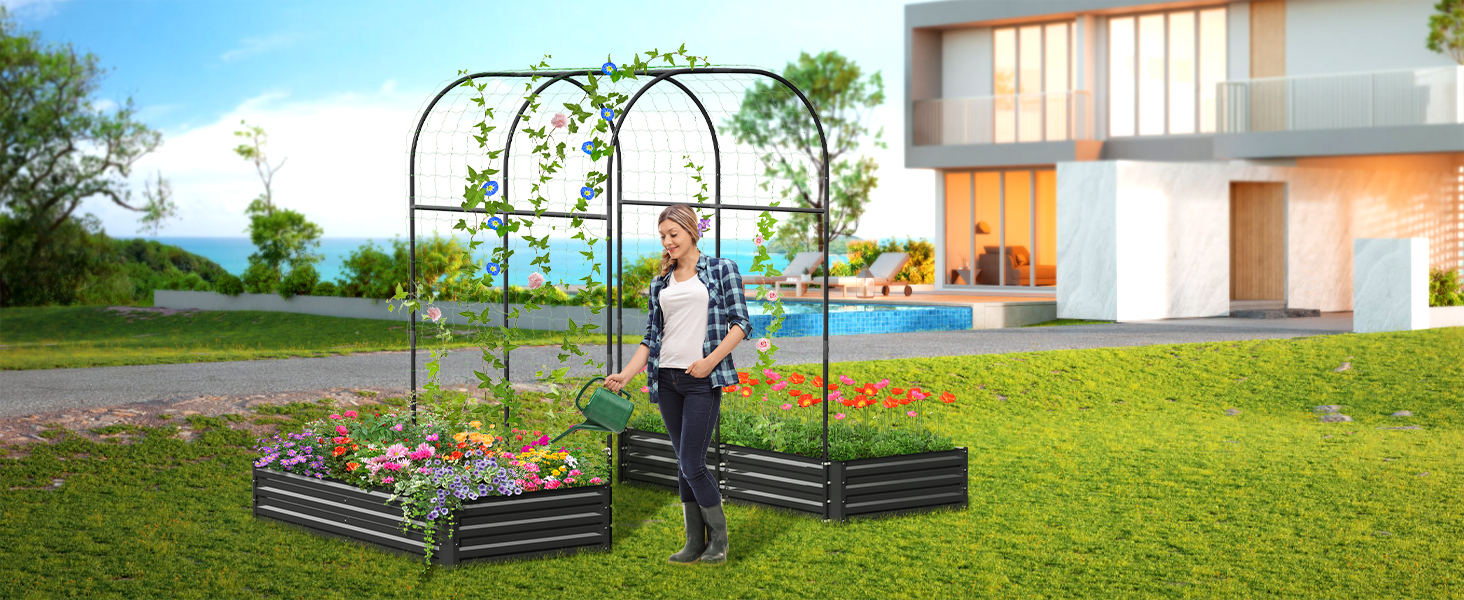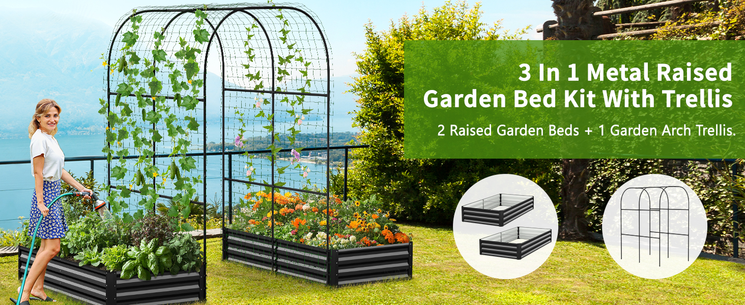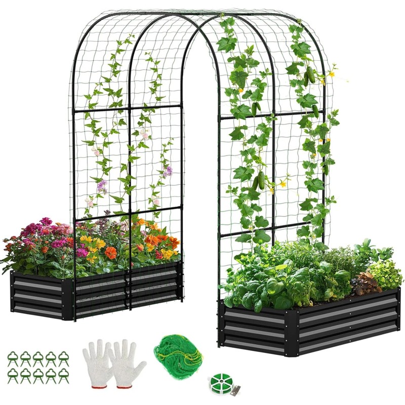 - 【3 IN 1 Raised Garden Bed with Trellis】DoCred Raised garden bed kit comes with 2 raised garden beds, one 87inch tall garden arch trellis for climbing plants, paired with climbing net for support, making it a comprehensive gardening solution. Upgraded design provides you with convenience and affordability.