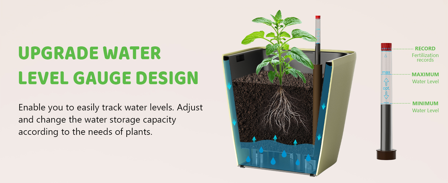 - Water Level Monitor: These self watering planters with a water level monitor allows you to easily monitor the watering condition and the watering time. No need to guess when to water your plants, save your time and energy while keeping the plants in a healthy state