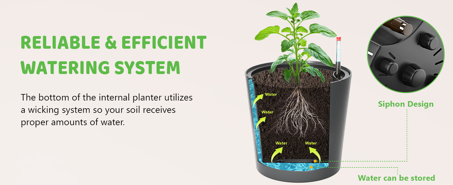 - Innovative Self Watering System: A reliable and efficient solution to deliver water to your plants without worrying about overflow. Just fill the pot with water once and it can supply water for up to 1.5 months! This innovative design provides new gardeners with a worry free way of planting!