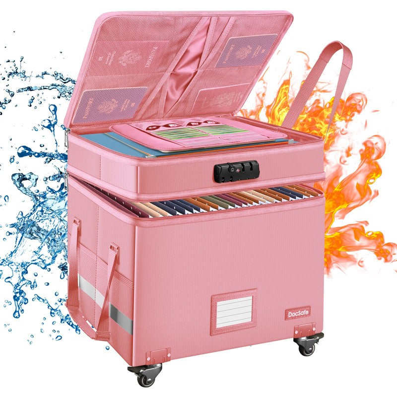 DocSafe File Box with Lock,2-Layer Fireproof Document Box with Wheels,Collapsible Rolling File Storage Organizer with Pockets,Large Portable Home Office Filing Cabinet Safe for Hanging Folders,Pink