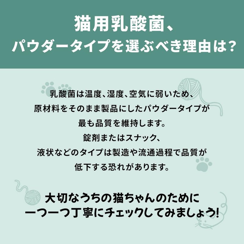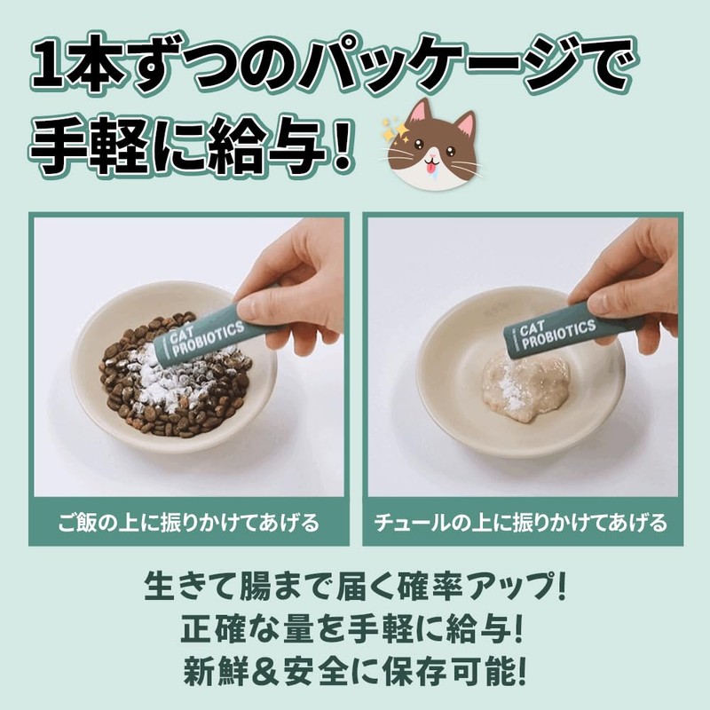 - Improve intestinal health: Meals and treats that cats eat are mostly heated, and they are lack of nutrition. Lack of nutrients can cause intestinal balance imbalances such as diarrhea and constipation. Probiotics balances the intestinal environment and creates a healthy intestinal environment