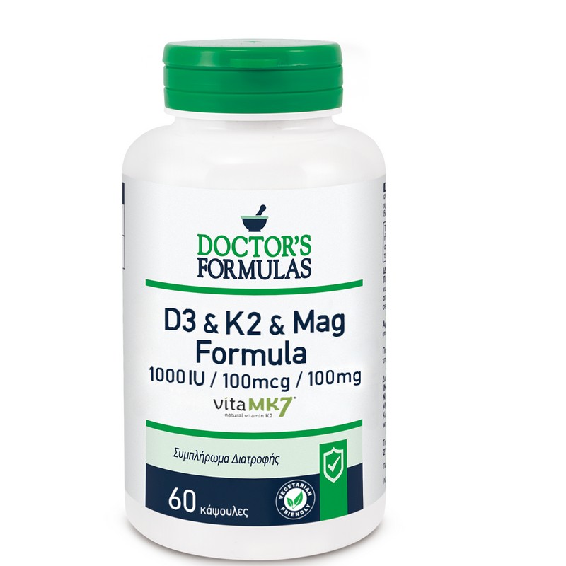 D3 & K2 & MAG FORMULA is a dietary supplement containing 1000 units of vitamin D3 as cholecalciferol, 100μg of vitamin K2 as menaquinone-7, and 100mg of magnesium derived from magnesium oxide and magnesium citrate.