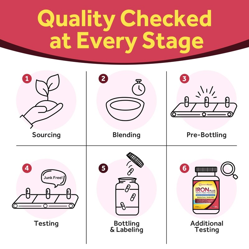Doctor's Recipes Iron Supplement for Women Men - Gentle Iron Bisglycinate with Vitamin C, B6, Folate & B12 - Non-Constipating & Stomach Friendly Iron Pills for Blood & Energy Support, 180 Vegan Caps