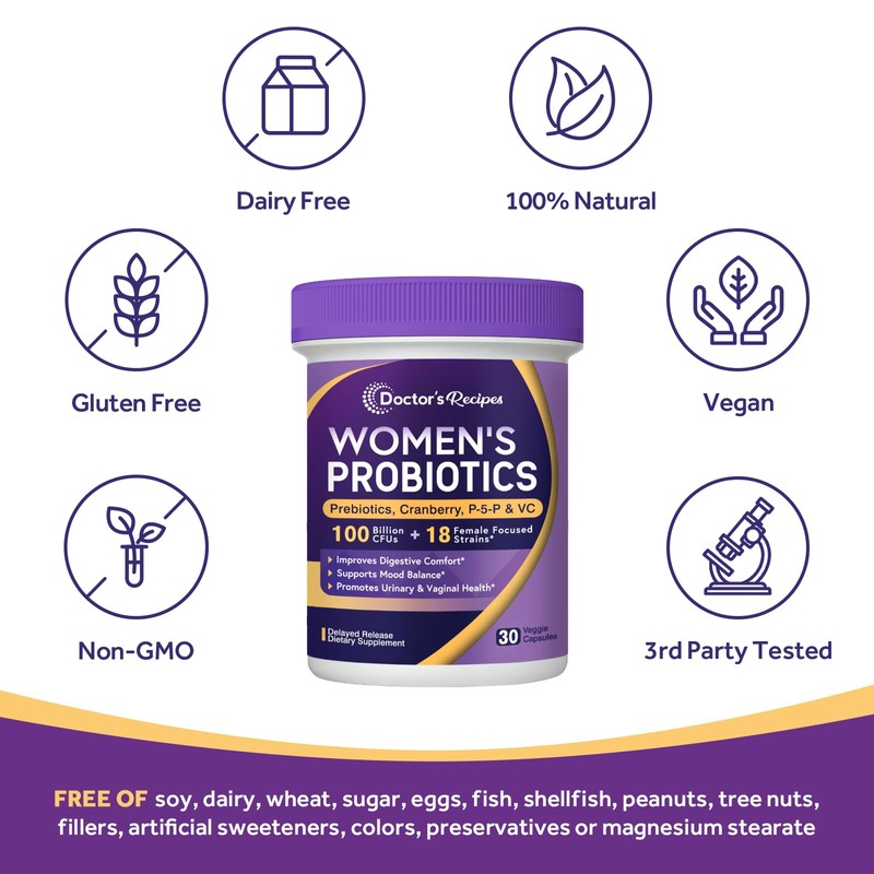 - Proudly Made in the USA: Our advanced strength formula is loaded with the highest grade & naturally sourced ingredients in a GMP certified facility in the USA. Doctor's Recipes Women's Probiotics is 100% pure, natural, vegan friendly & NON-GMO with no soy, gluten and dairy.