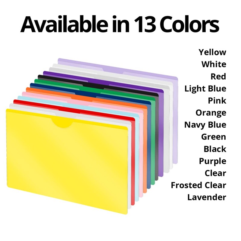Our heavy duty pocket folders are available in multi colors: Red, Green, Yellow, Orange, Black, Light Blue, Navy Blue, Pink, Purple, Clear, Frosted Clear and White. Offered in bulk/packs of 25, 50, and 100 in either single or assorted color.