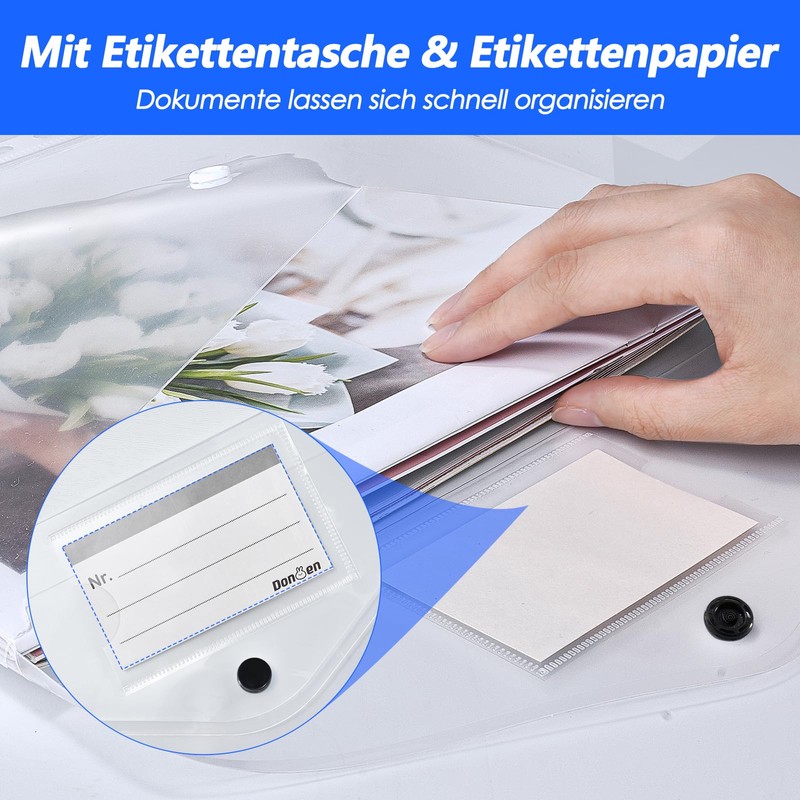 - ✅LABEL POCKET AND LABEL PAPER The surface of the clear pocket is designed with a pocket and a card with the Donken logo. The card allows you to mark, categorise and manage your documents to quickly find your important documents.