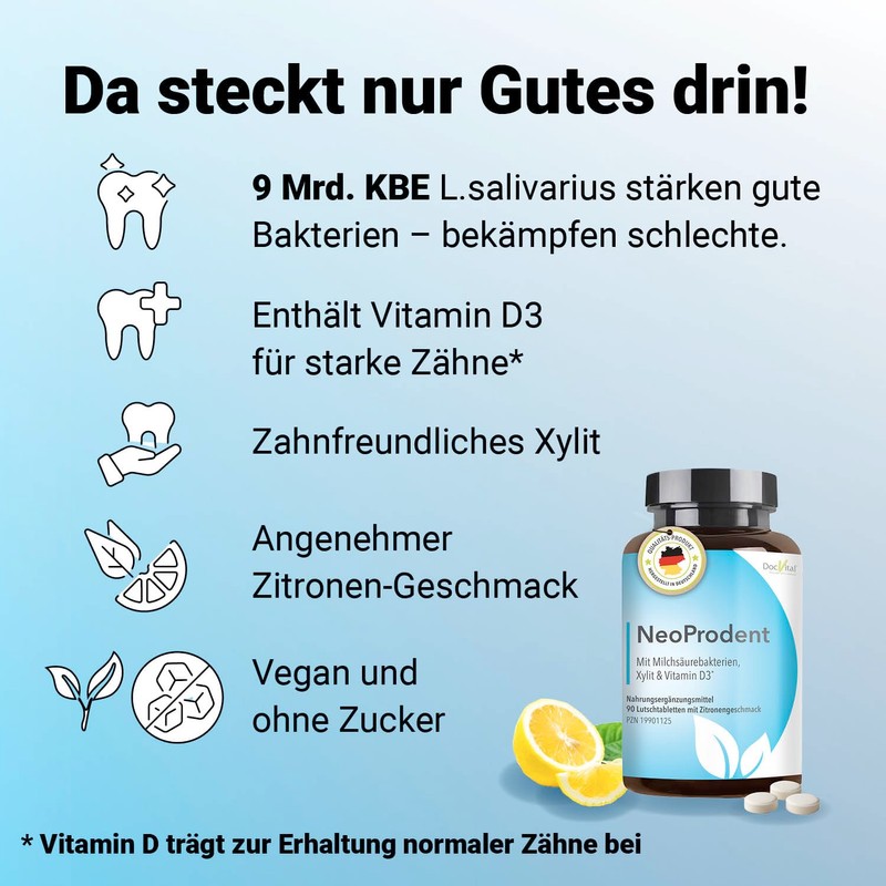 DocVital® Mundgeruch bekämpfen - 90 Mundhygiene Lutschtabletten in pharmazeutischer, deutscher Qualität - Zitronengeschmack - NeoProdent mit Lactobacillus Salivarius, Xylitol, Vitamin D