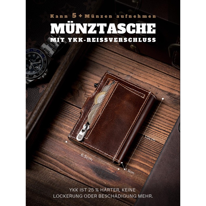 - 1.5 cm ultra-thin: The ultra-thin design undermines traditional concepts. The slim wallet is 10 x 6 x 1.5 cm, but has an amazing capacity! It is made from carefully selected full-grain cowhide leather and easily holds 7-9 cards, 10 banknotes and 5 coins. Carry it with you without strain. Although ultra-thin, the slim wallet with coin compartment can hold the world.